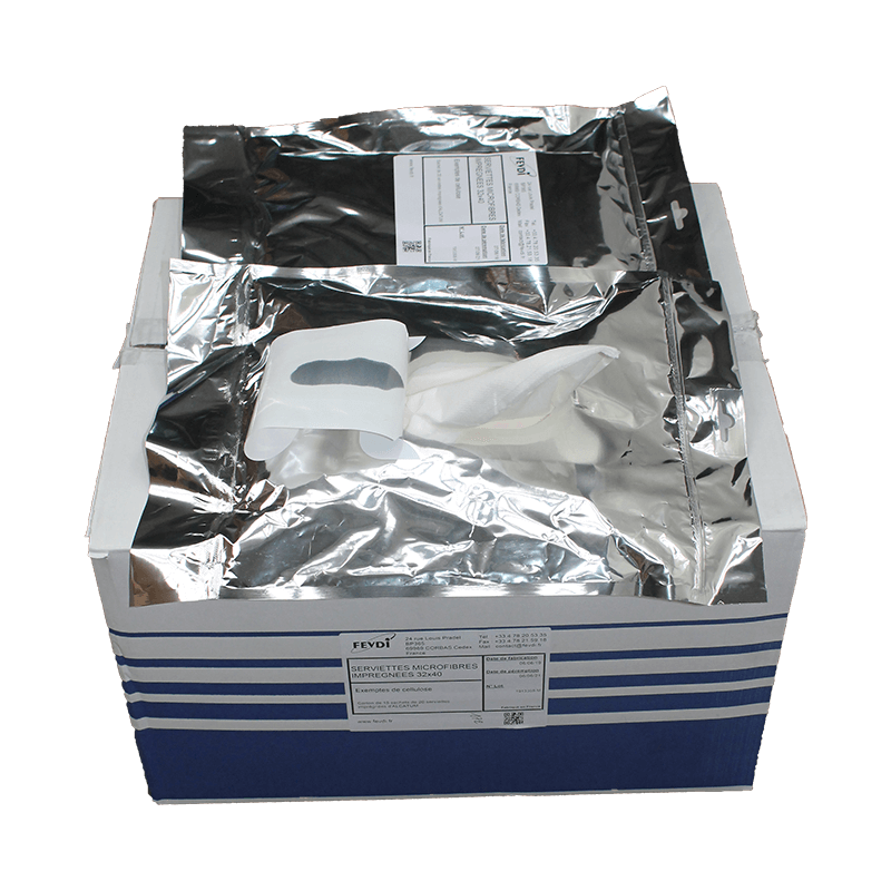 Serviettes pour le nettoyage, la décontamination et le dégraissage des surfaces lisses. Exemptes de cellulose, non tissées, non pelucheuses. Résistantes et compatibles avec l'acide nitrique.