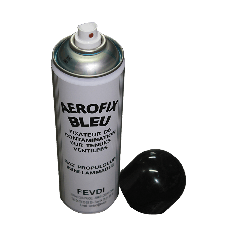 Fixateur de contamination sur textiles et matériaux plastiques souples (ex : tenues MURU) en aérosol. Forme un film bleu résistant aux hautes températures et aux UV.