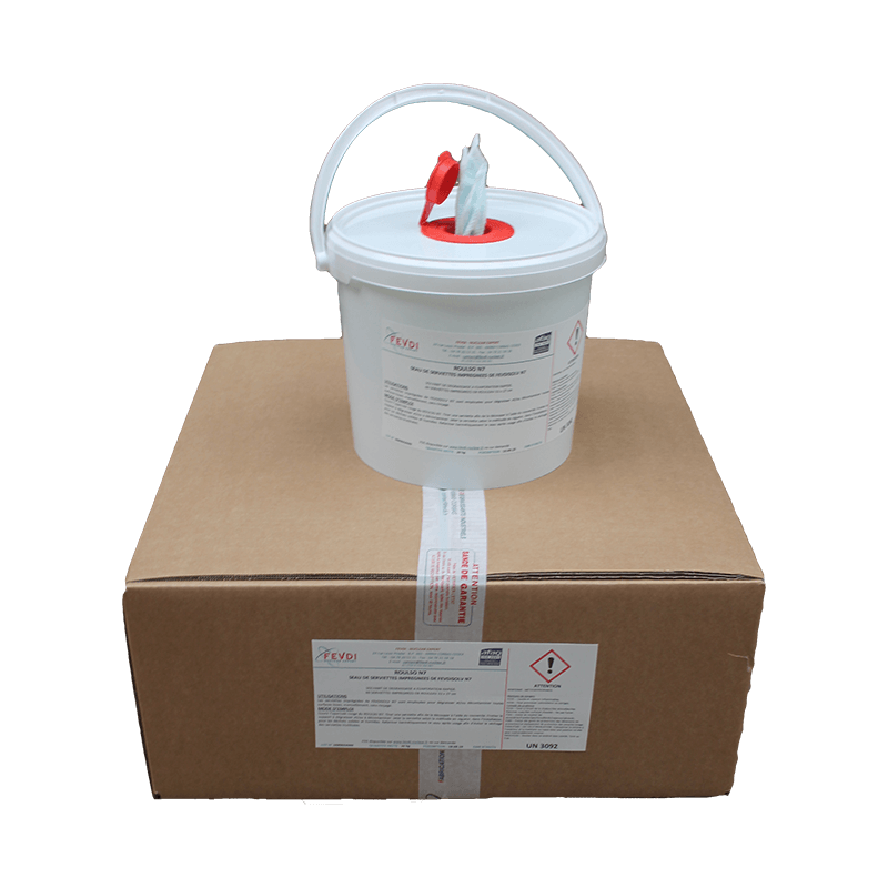 Seau dévidoire contenant un rouleau de 80 formats 32x27 cm de serviettes imprégnées de FEVDISOLV N7, solvant dégraissant à évaporation rapide. Ne laisse pas de trace après dégraissage puis séchage.